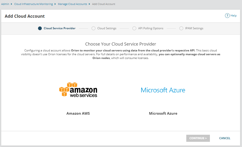 - Select the cloud service provider for which you want to add an account, and click Continue.