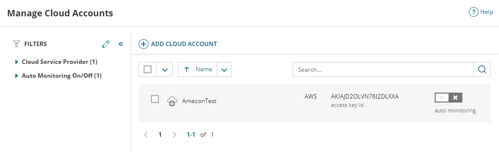 The Manage Cloud Accounts page is displayed, showing the account you added, showing the access key ID.