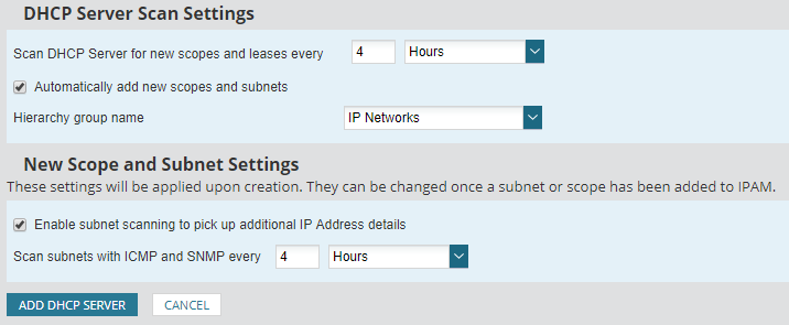 - If you want IPAM to scan using ICMP and SNMP to obtain additional IP Address details, check the Enable subnet scanning box and select the scanning interval.