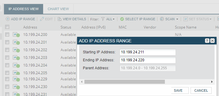 By default, IPAM displays all IP addresses in a subnet if the selected subnet contains 4,096 or fewer IP addresses (/20 or 255.255.240.0 and higher mask). For smaller subnets, it is not necessary to add IP address ranges for monitoring unless you have previously deleted the addresses in the range you want to add.