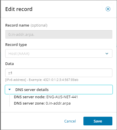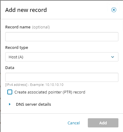 Enter the IPv4 address, and check the box if you want to create an associated pointer (PTR) record. Host (AAAA) IPv6 address record Enter the IPv6 address