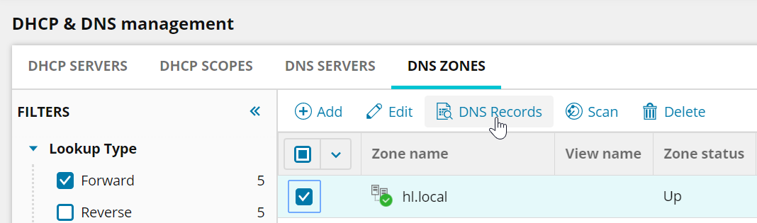 - Click on DNS Zones and use the filters on the left to find the required zone if necessary.