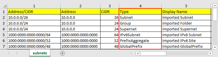 For a structure spreadsheet, only the Type of each object needs to be provided. This can be Group, Supernet, Subnet, IPv6Subnet, GlobalPrefix, PrefixAggregate, etc.