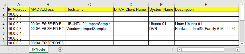 A subnet spreadsheet contains an IP address on each row. Only the IP Address is mandatory.