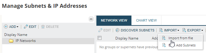 IPAM provides two methods to easily import IP addresses and subnet data into your network, either by importing from spreadsheets as described in this topic, or bulk adding by entering Subnet/CIDR prefixes.