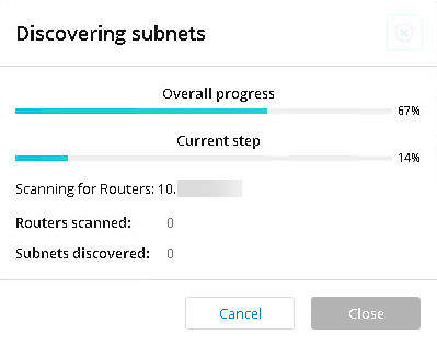 - Adjust the Discovery Settings sliders for Hop Count and SNMP Timeouts. IPAM scans the default gateway and any other selected routers within the range of hops you determine. Click Discover subnets. The Discovering subnets progress bar is displayed.