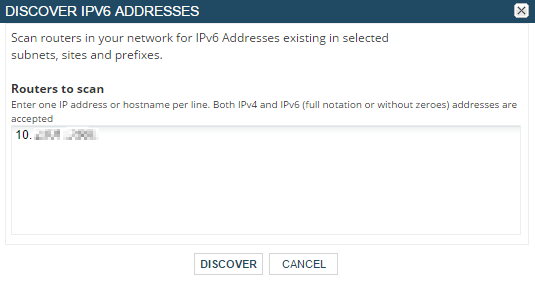 - Click Discover IPs to access this functionality from the IPv6 subnet(s) or IPv6 Global prefix menus.