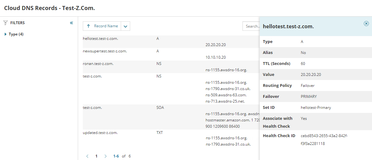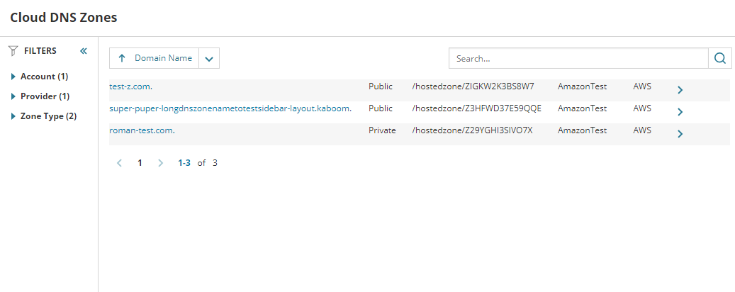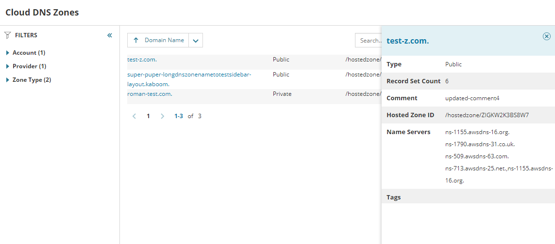 - Filter the list of DNS Zones being monitored by account, provider or zone type (public or private).