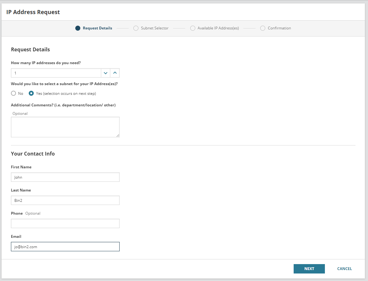 - From the SolarWinds Web Console, go to My Dashboard > IP Addresses > Request IP Address.