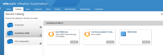 - Click Catalog > SolarWinds IPAM, and then click Request on WS2K12R2 (the blueprint just created).