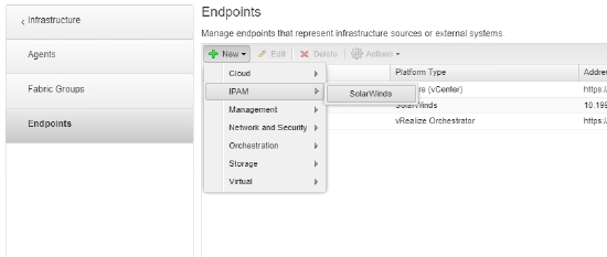 - Click New > IPAM > SolarWinds.