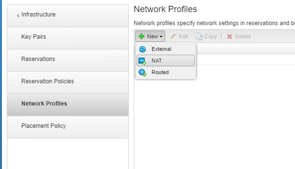 - Go to Infrastructure > Reservations > Network Profiles, and then New > External to create anew network profile.