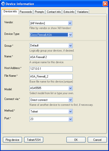 The existing configurations for the device are selected. Once you've made the changes to your device, test the configuration by clicking Ping Device. If the test returns successful, click OK.