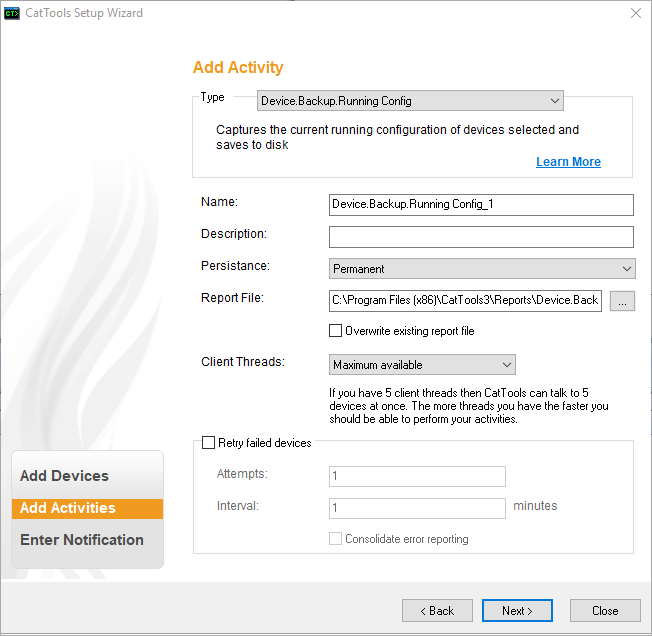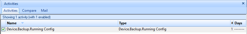 An activity is a task that Kiwi CatTools performs against one or more of your network devices that you have added to the Kiwi CatTools database, for example Backing up the running configurations of a device. To create an activity using the Setup Wizard, complete the required fields and follow on-screen prompts.