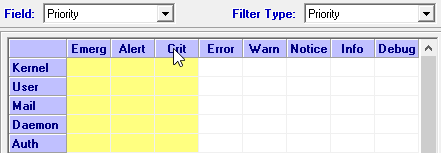 Each incoming message contains a priority value, consisting of a facility and a level. Use the Priority filter to trigger an action when you receive high or low priority messages. For example, you can create a rule that sends an email when you receive a message with a critical or higher priority level.