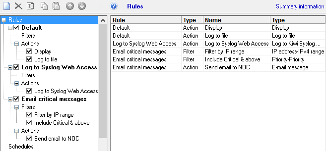 Rules define what action legacy Kiwi Syslog Server (KSS) takes when it receives a message. This example creates a rule to log each message to a file. The log files are automatically split based on the current date and the IP address of the sending device. Legacy KSS writes a new log each day for each device.