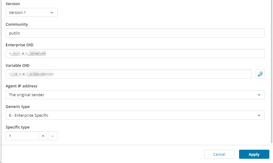 1.3.6.1.x.x.x.x) that represents the MIB enterprise of the SNMP trap.If the Generic Type is set to 6, it indicates an Enterprise type trap. In this case the Specific Trap value needs to be considered.