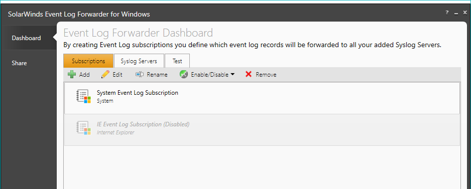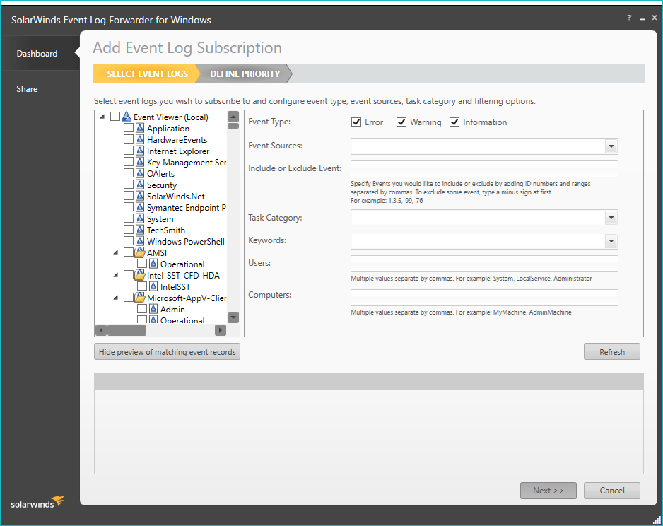 - Select the event log (or event logs) you wish to subscribe to from the left column tree.