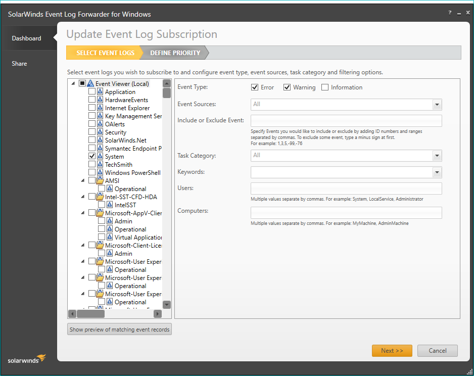 - Click Refresh to preview selected filtering changes on the event log records.