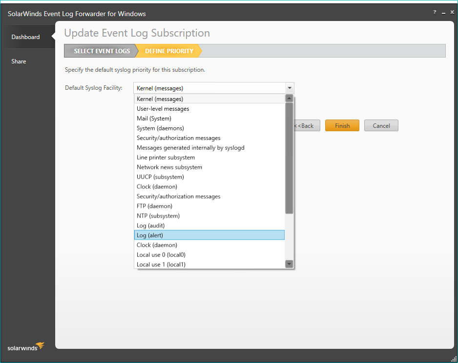 - Confirm or update your default syslog facility settings.
