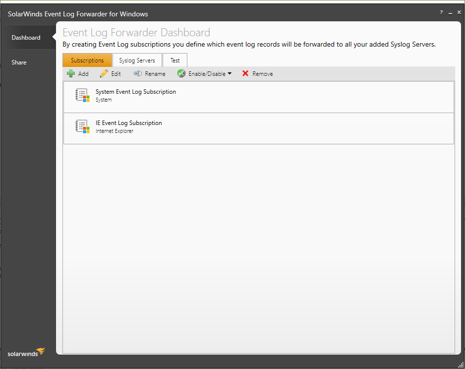 Creating event log subscriptions defines which event log records are forwarded to your syslog servers. The Subscriptions screen allows you to add or maintain the subscriptions you have created for the Event Log Forwarder program.
