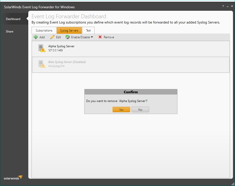 - In the confirmation message box, click Yes to continue removing the selected syslog server.