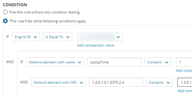 The log entry conditions vary by log source type. In the example below, an incoming SNMP Trap message meeting specified Varbind element with OID and name criteria will trigger the designated alert action.