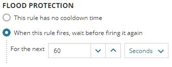 Expand Advanced Settings and specify how much time to prevent rule from firing for flood protection. The default value is no cooldown time.