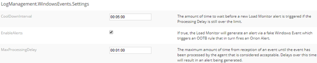 If the LA agent on a remote server becomes overloaded and fails to process events within a designated time (one minute by default), the agent sends a notification event to the Log Analyzer and triggers an alert in the SolarWinds Platform Web Console.