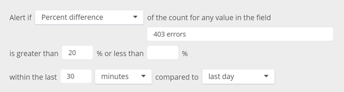 For example, an alert for the count of 403 errors in a rolling window of 30 minutes jumps by 20% as compared to the count of errors during the last day would look like this: