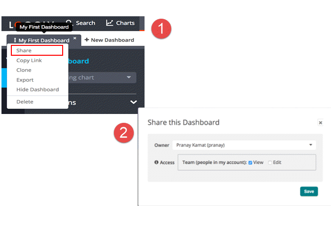 Share. Opens the permission window where you can change owner and set view or edit permissions for the dashboard.