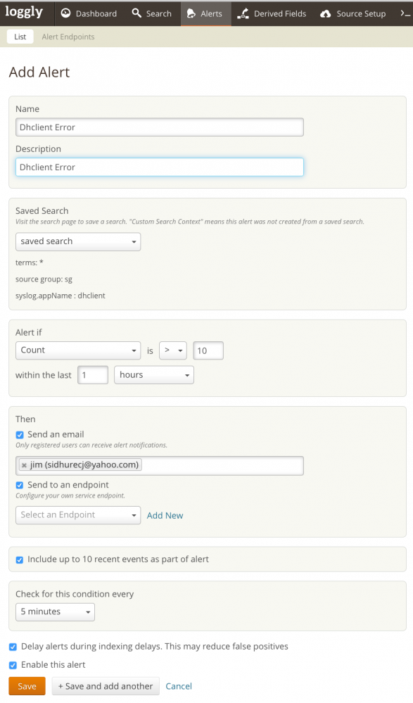 - Use the Recipients field to specify who should receive the Loggly alerts. User(s), group(s), escalations policies, and on-call schedules can be specified as alert recipients. Auto-complete suggestions are provided as you type.