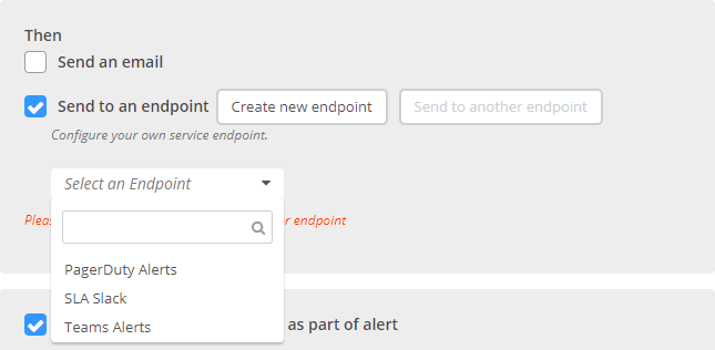 In the Then pane, select the Send to an Endpoint check box, and then go to the drop-down menu and select the PagerDuty endpoint you just created.