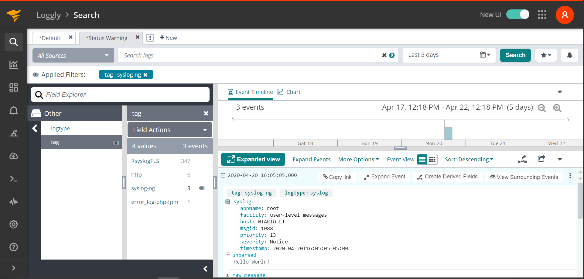 Search Loggly for events with the logtype as syslog over the past hour. It may take few minutes to index the event. If if doesn’t work, see the troubleshooting section below.