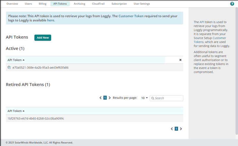 Your API token is used to provide access to Loggly’s API for your user account. This functionality is currently available to all Loggly API users. Additional tokens are often useful to segment client authorization or to replace existing tokens in the event a token is compromised.