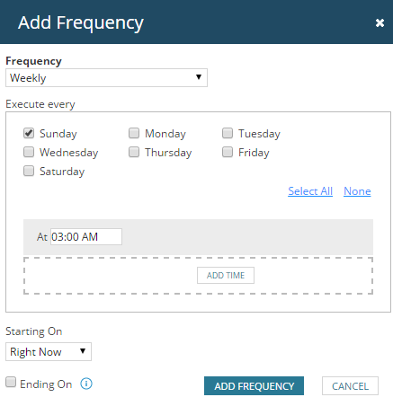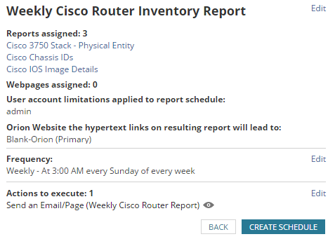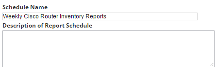 The following example schedules a weekly report for Cisco 3750 Stack - Physical Entity, Cisco Chassis IDs, and Cisco IOS Image Details. This report will run every Sunday and sends the details to all recipients by email.