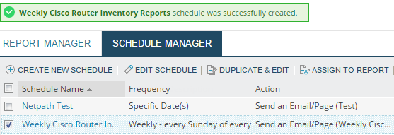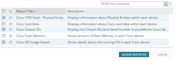 - Search for NCM Cisco Inventory reports and select reports. This example shows three assigned reports.