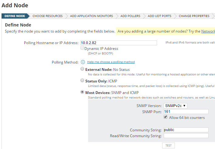To learn how to complete the remaining steps for adding a node, see Add a single node for monitoring to the SolarWinds Platform.