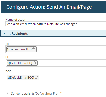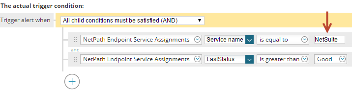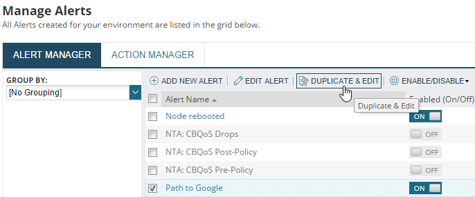 This example shows how to duplicate and edit the out-of-the-box alert Path to Google to create an alert for the new path to NetSuite. When the path to Netsuite breaks, an alert is triggered.