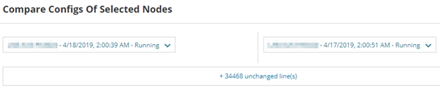 After you select the configs to compare, the Compare Configs Of Selected Nodes window displays the configs next to each other. To help you quickly identify changes, the page displays only the mismatched lines and the lines immediately surrounding them.