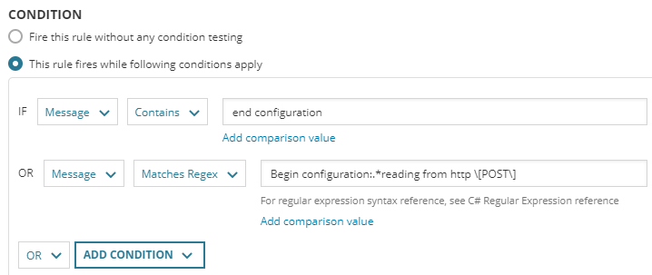 If the rule applies to multiple device types, select Or, click Add Condition > Field condition, and specify another string or regular expression.