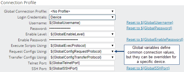 Global variables allow you to specify common values used to enable NCM to communicate with devices. Global variables can be used in scripts and they can be specified in a device's connection profile.