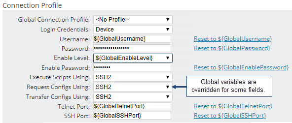 When a node is configured to use device-level login credentials, the connection profile for that node specifies the login credentials and other connection information NCM uses to connect to that node. By default, the connection profile for each NCM node uses a set of global variables to define the value of each field, as shown below. You can specify a different value for any field.