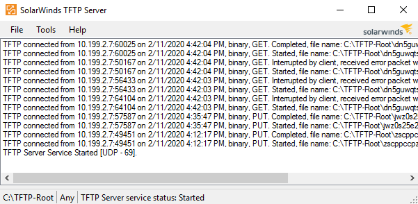 When you install NCM, the SolarWinds TFTP server is automatically installed on the SolarWinds Platform server and on any additional polling engines (APEs). If TFTP (Trivial File Transfer Protocol) is used to transfer configuration files to and from your network devices, NCM uses the SolarWinds TFTP server.
