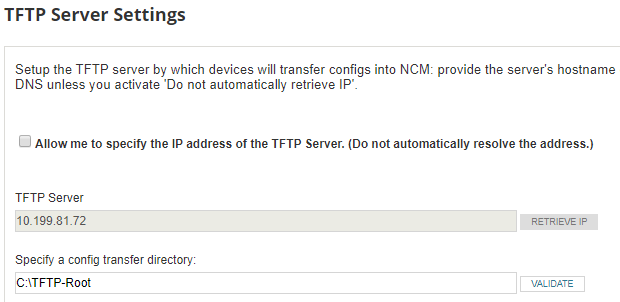 - If you want to manually enter each IP address, select Allow Me to Specify the IP Address of the TFTP Server. Otherwise, NCM automatically resolves each IP address via DNS.