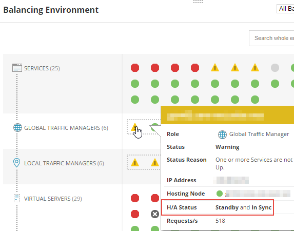 Devices in one traffic group are connected by dotted rectangles on the Balancing Environment resources. Display the tooltip to see details about the H/A failover and synchronization status.