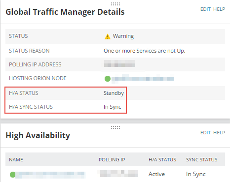 You can see the H/A statuses in tooltips, and on the LTM or GTM detail views. The GTM or LTM details resource shows the H/A status and synchronization status. In the High Availability resource, you can check the details about other members of the traffic group.