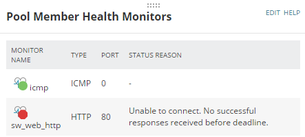 To monitor the health of your load balancing environment, NPM polls health monitors on your F5 servers (nodes), and on F5 pool members. Health monitors run periodic tests for network service availability, such as ICMP, HTTP, IMAP, or MSSQL.