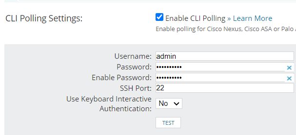 - Select Enable CLI Polling, enter the credentials, and click Test.