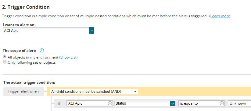 - Change the trigger condition to say Alert me when the ACI APIC status is equal to Unknown, and click Next.